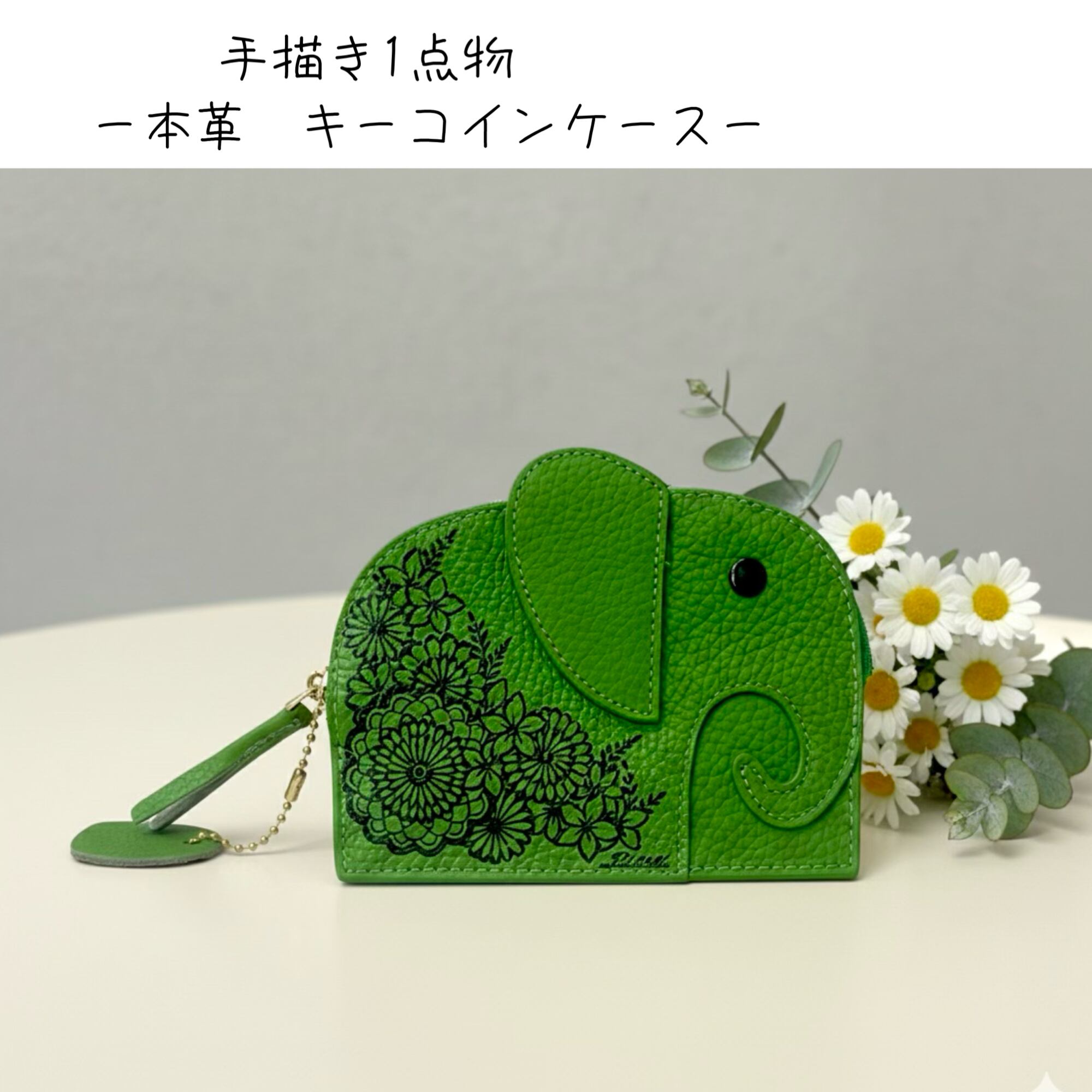 花の模様を本革のゾウのケースに、1つ1つ手描きしました!!