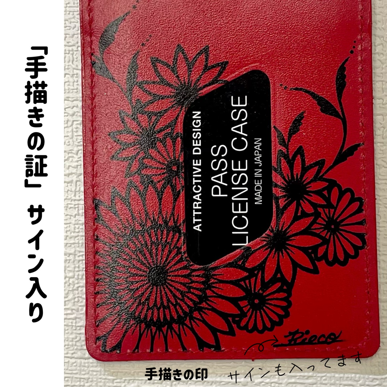 花文様デザイン パスケース《緋の咲紋》(手描き)