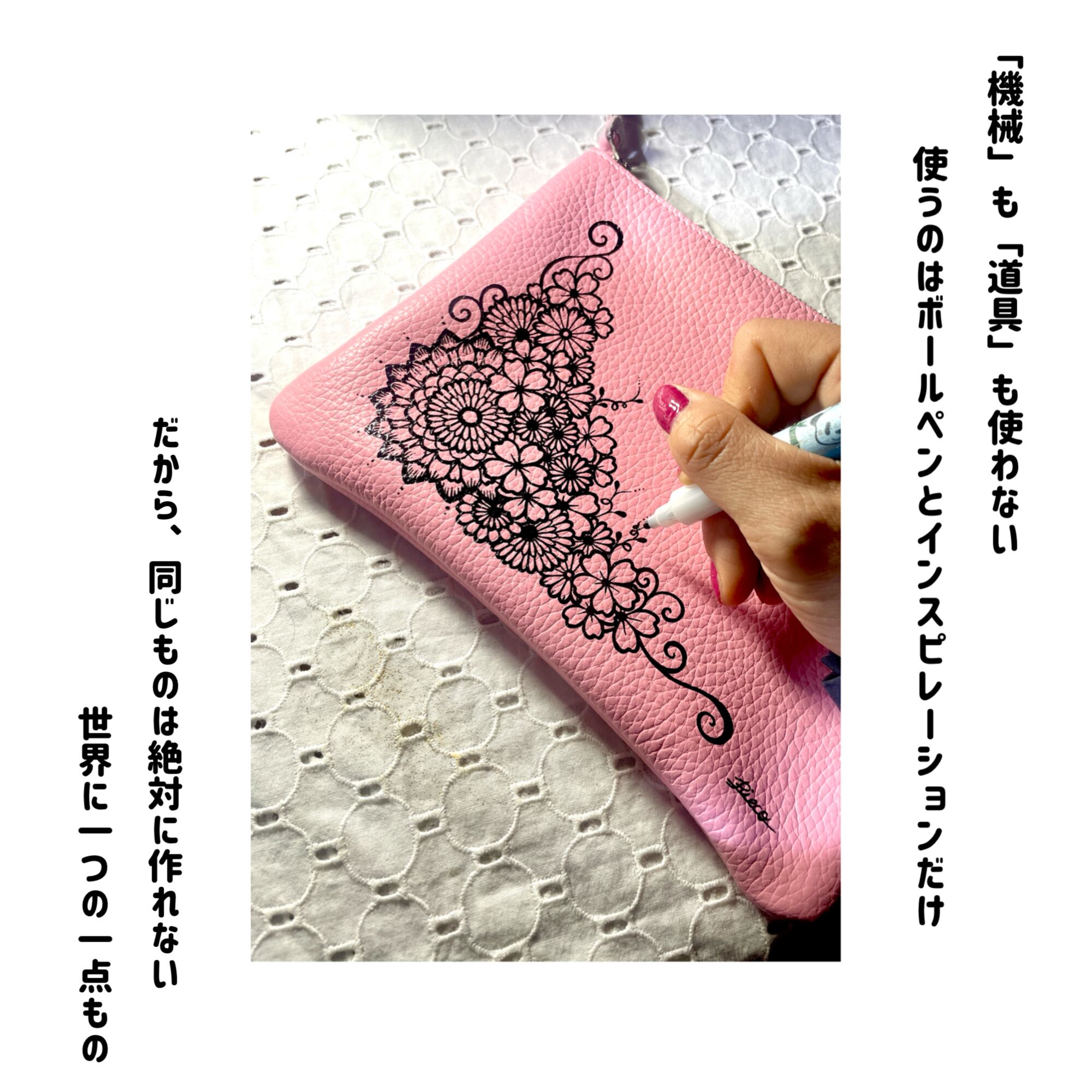 柔らかな桃色のレザーに、花々が舞うように咲き広がる——