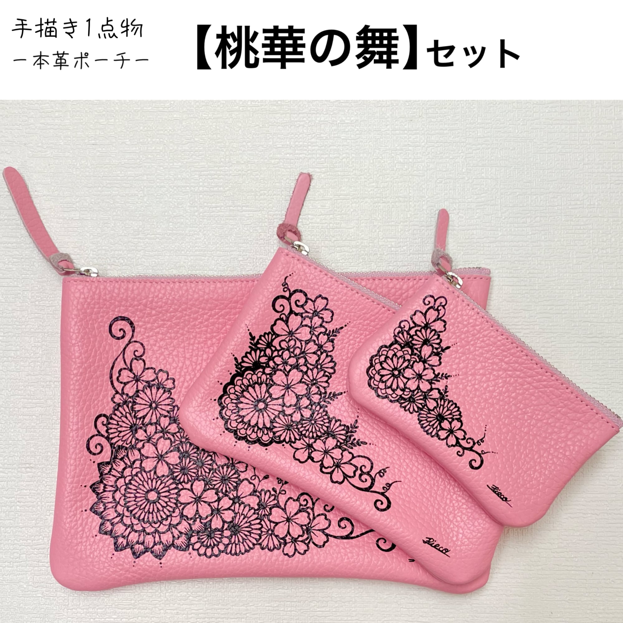 花文様デザイン 本革ポーチセット【桃華の舞】