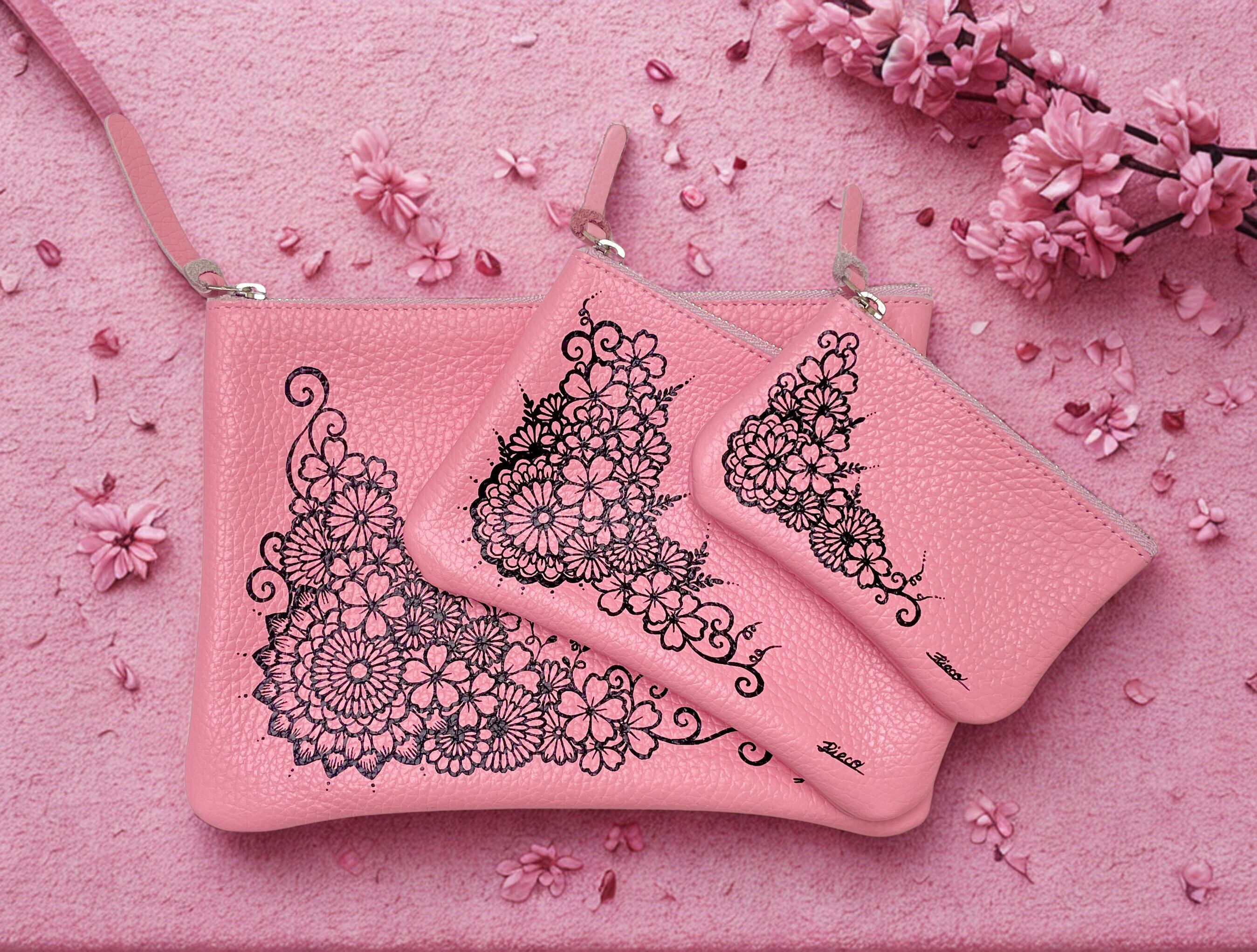 柔らかな桃色のレザーに、花々が舞うように咲き広がる——