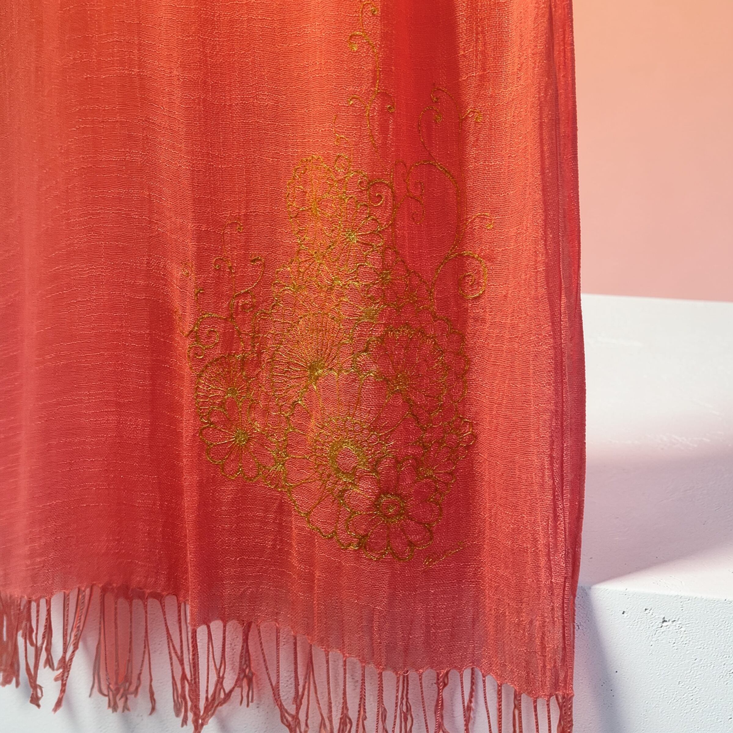独自の魅力を放つ、サーモンピンクの手描きストールが登場です!